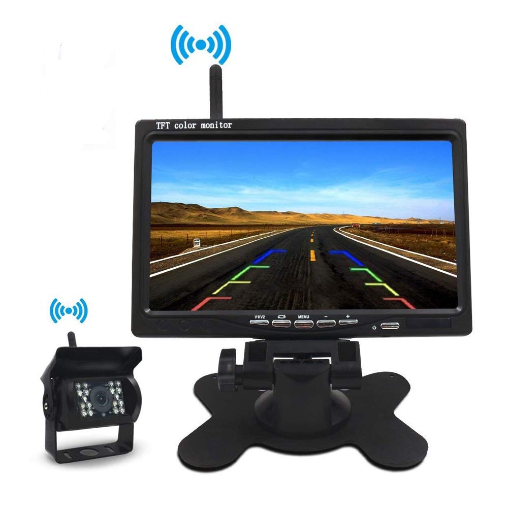 Caméra de Recul sans Fil Kit 7 Pouces TFT LCD Miroir Moniteur Signal Amélioré 2.4G/IP67 étanche/Vision Nocturne de 18pcs LED,pour Camion Remorque RV Bus Camping-Car